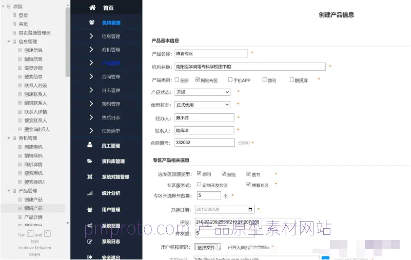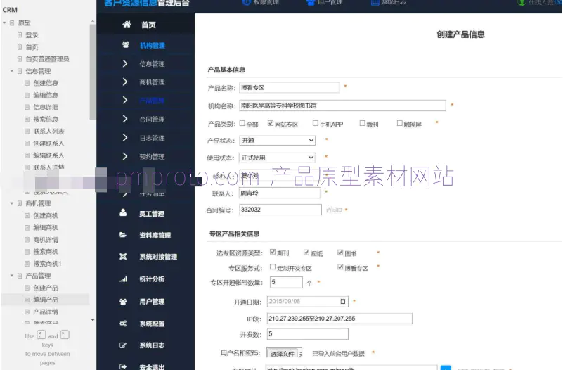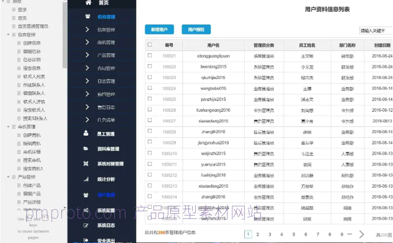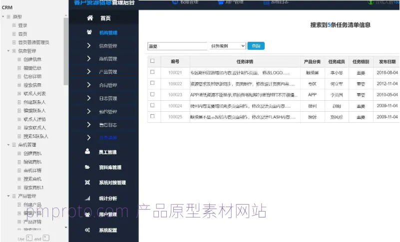 原型、登录、首页、首页普通管理员、信息管理、创建信息、编辑信息、信息详细、搜索信息、联系人列表、创建联系人、编辑联系人、联系人详情、搜索联系人、搜索5联系人、商机管理、创建商机、编辑商机、商机详情、搜索商机、搜索商机1、产品管理、创建产品、编辑产品、产品详情、搜索产品、合同管理、创建合同、编辑合同、合同详情、搜索合同、日志管理、创建日志、编辑日志、日志详情、搜索日志、预约管理、创建预约、编辑预约、预约详情、搜索预约、售后日志、创建售后日志、编辑售后日志、售后日志详情、搜索售后日志、任务清单、回复任务、回复任务清列表、任务详情、任务详情1、搜索任务、员工管理、创建员工、编辑员工、员工信息详情、分包管理、搜索分包、搜索分包1、搜索员工、资料库管理、创建资料、编辑资料、资料详情、搜索资料、用户管理、创建用户、用户授权、编辑用户、修改密码、用户资料详情、搜索用户、系统配置、系统日志、搜索系统日志、系统对接管理、统计分析、消息内容